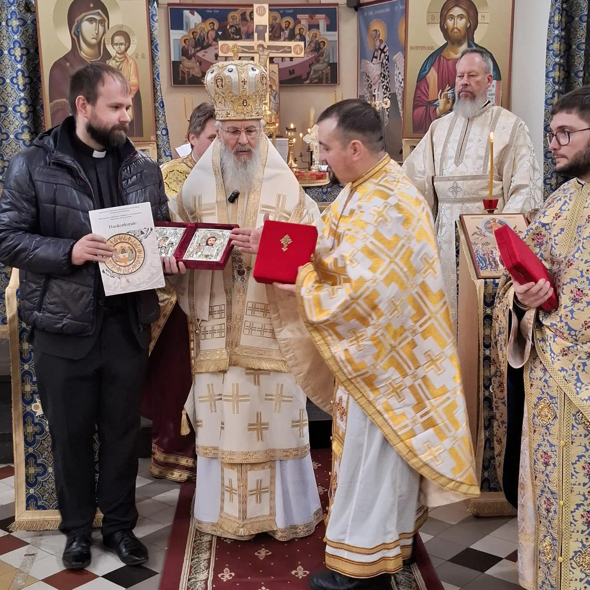 Ca semn de recunoștință și mulțumire pentru colaborarea și sprijin, Înăltpreasfinția Sa a acordat o distincție reprezentatului comunității romano-catolice, care găzduiește într-una din bisericile sale comunicatea creștin ortodoxă română din Leverkusen.